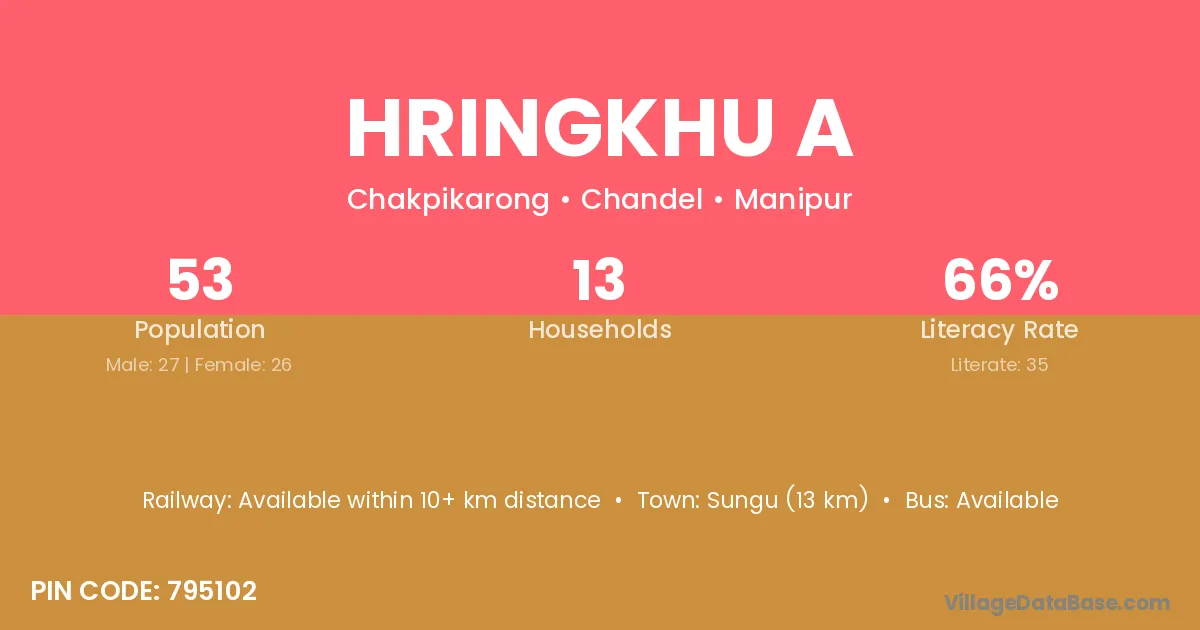 Hringkhu A village has a total population of 53 people, of which 27 are males and 26 are females.