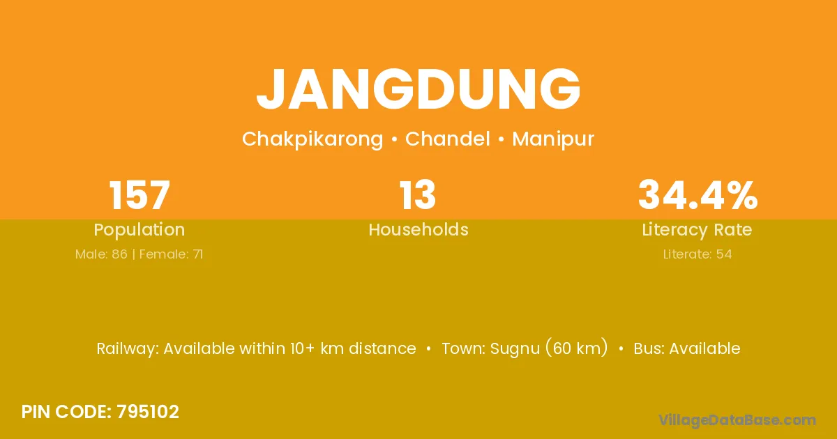 Sugnu (60 km) is the nearest town to Jangdung village for major economic activities and is located approximately 60 km away.