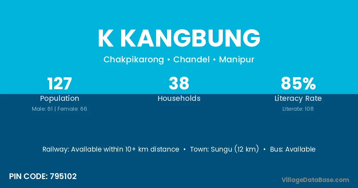 Sungu (12 km) is the nearest town to K Kangbung village for major economic activities and is located approximately 12 km away.