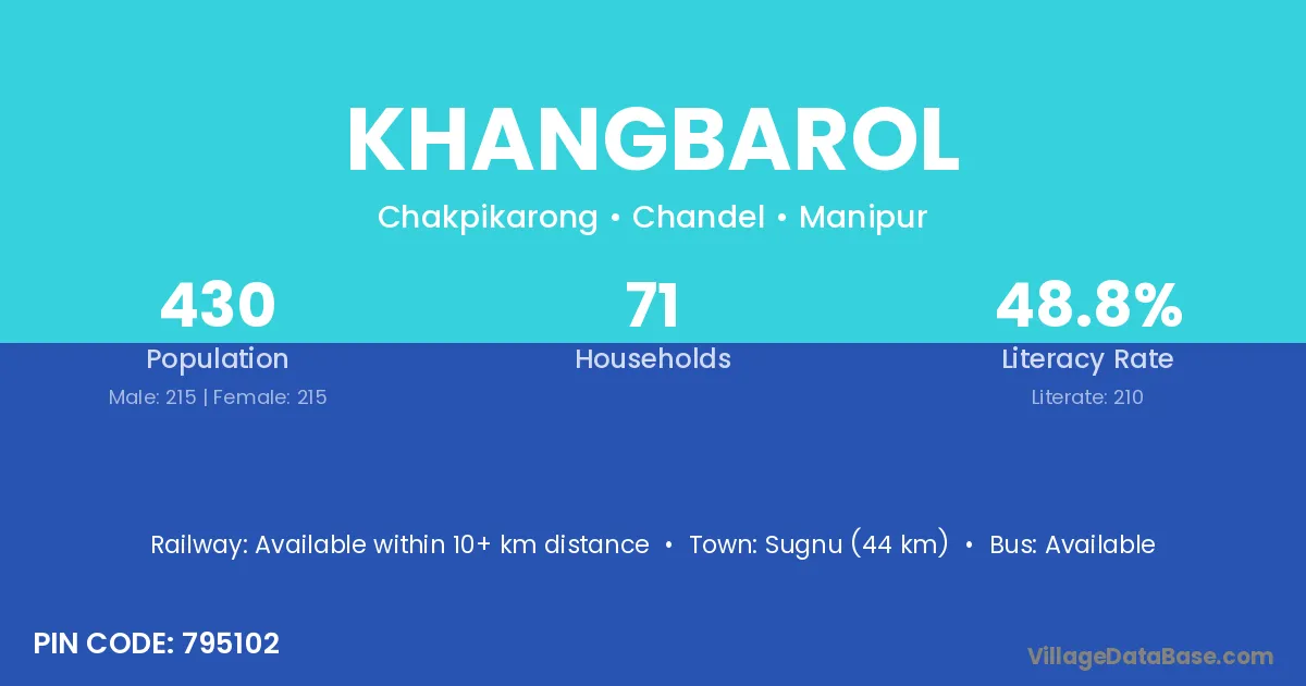 Sugnu (44 km) is the nearest town to Khangbarol village for major economic activities and is located approximately 44 km away.