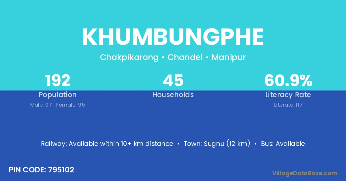 Khumbungphe village has a total population of 192 people, of which 97 are males and 95 are females.