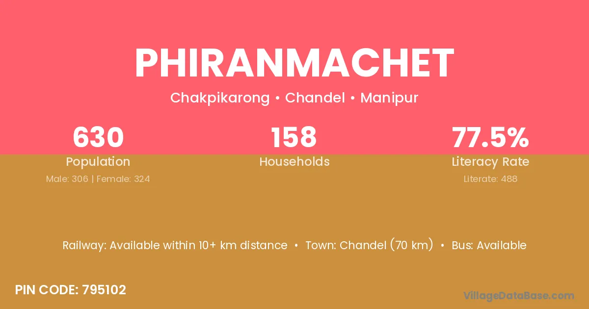 Chandel (70 km) is the nearest town to Phiranmachet village for major economic activities and is located approximately 70 km away.