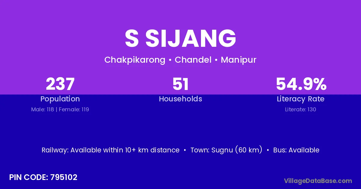 Sugnu (60 km) is the nearest town to S Sijang village for major economic activities and is located approximately 60 km away.