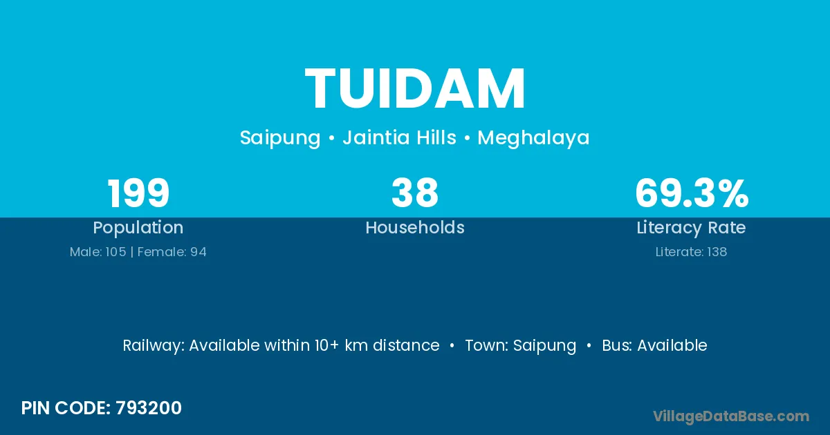 Moreh (25 km) is the nearest town to Tuidam village for major economic activities and is located approximately 25 km away.