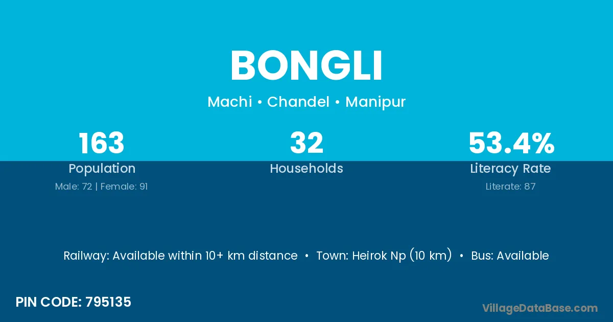 Heirok Np (10 km) is the nearest town to Bongli village for major economic activities and is located approximately 10 km away.