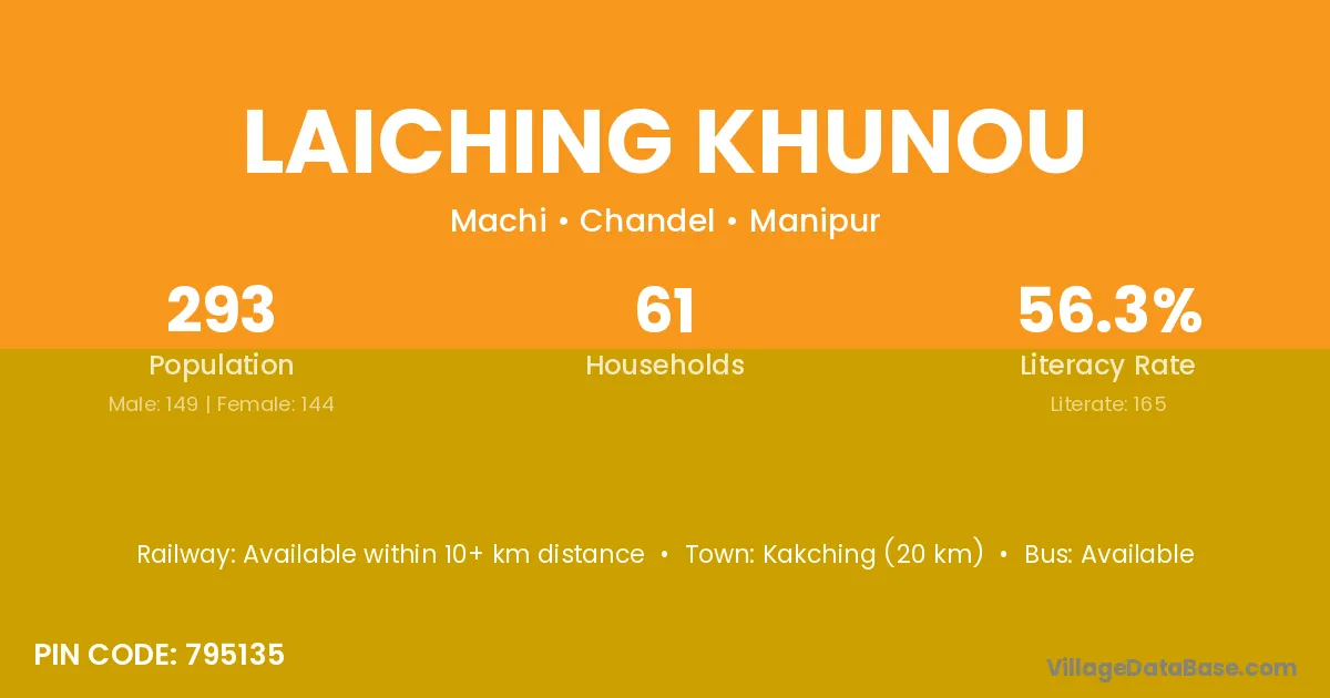 Kakching (20 km) is the nearest town to Laiching Khunou village for major economic activities and is located approximately 20 km away.