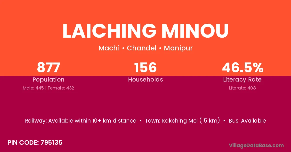 Laiching Minou village has a total population of 877 people, of which 445 are males and 432 are females.