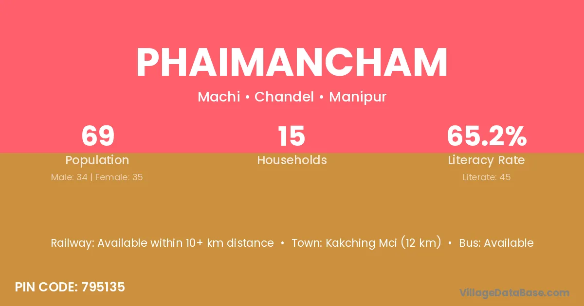 Phaimancham village has a total population of 69 people, of which 34 are males and 35 are females.