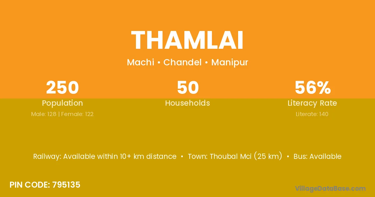Thoubal Mci (25 km) is the nearest town to Thamlai village for major economic activities and is located approximately 25 km away.