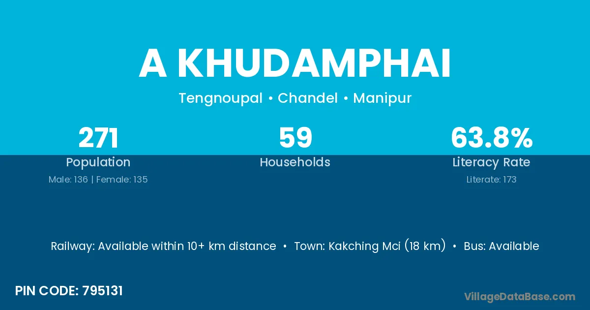 Kakching Mci (18 km) is the nearest town to A Khudamphai village for major economic activities and is located approximately 18 km away.