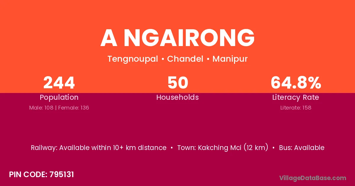Kakching Mci (12 km) is the nearest town to A Ngairong village for major economic activities and is located approximately 12 km away.