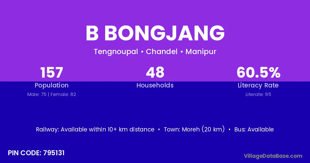 Moreh (20 km) is the nearest town to B Bongjang village for major economic activities and is located approximately 20 km away.