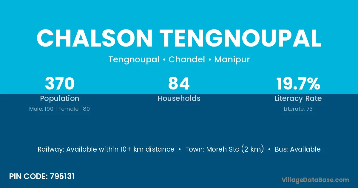Moreh Stc (2 km) is the nearest town to Chalson Tengnoupal village for major economic activities and is located approximately 2 km away.