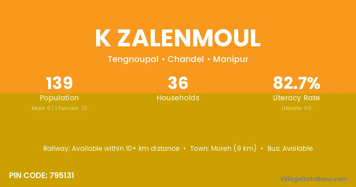 Moreh (9 km) is the nearest town to K Zalenmoul village for major economic activities and is located approximately 9 km away.