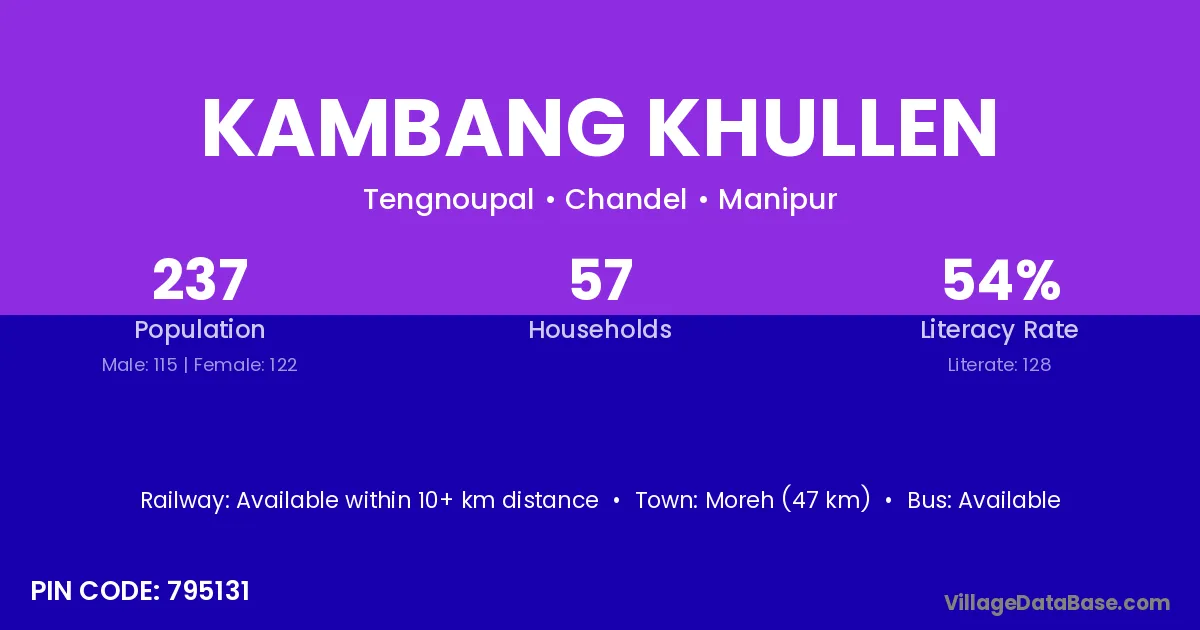 Moreh (47 km) is the nearest town to Kambang Khullen village for major economic activities and is located approximately 47 km away.