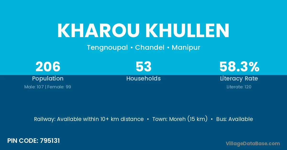 Moreh (15 km) is the nearest town to Kharou Khullen village for major economic activities and is located approximately 15 km away.