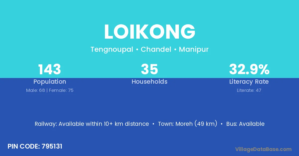 Moreh (49 km) is the nearest town to Loikong village for major economic activities and is located approximately 49 km away.