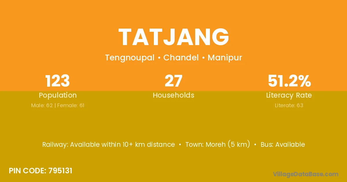 Moreh (5 km) is the nearest town to Tatjang village for major economic activities and is located approximately 5 km away.