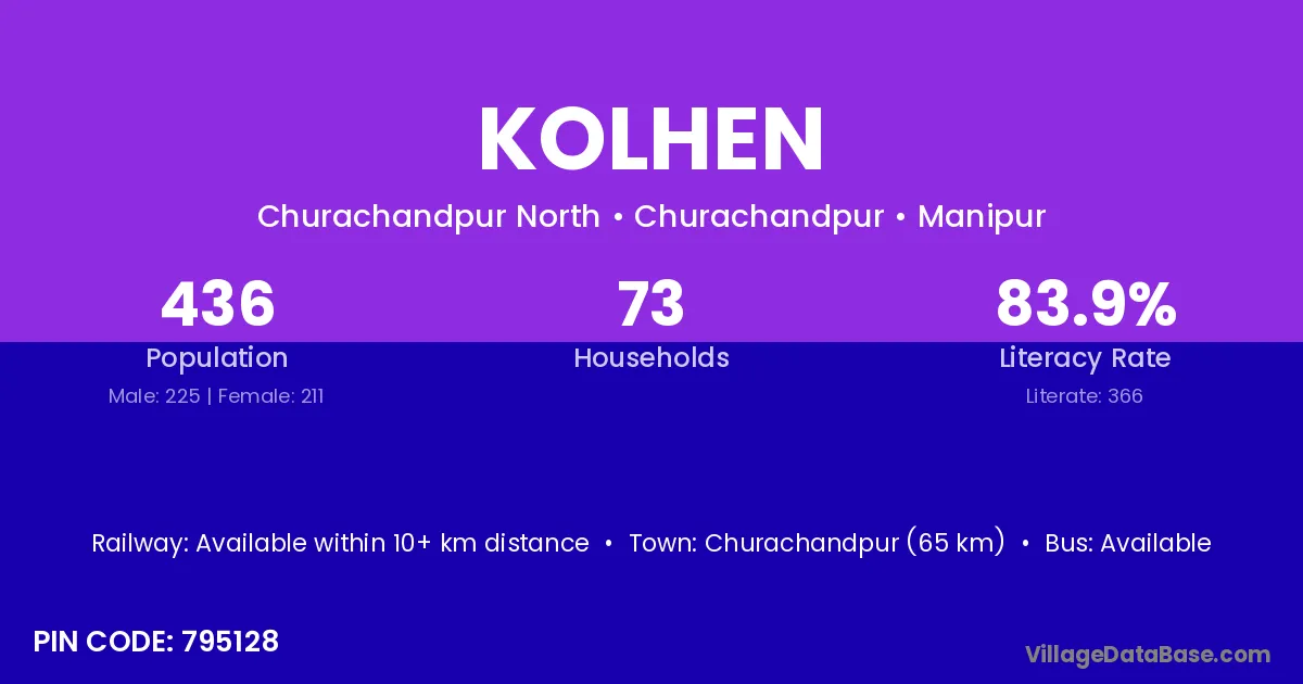 Churachandpur (65 km) is the nearest town to Kolhen village for major economic activities and is located approximately 65 km away.