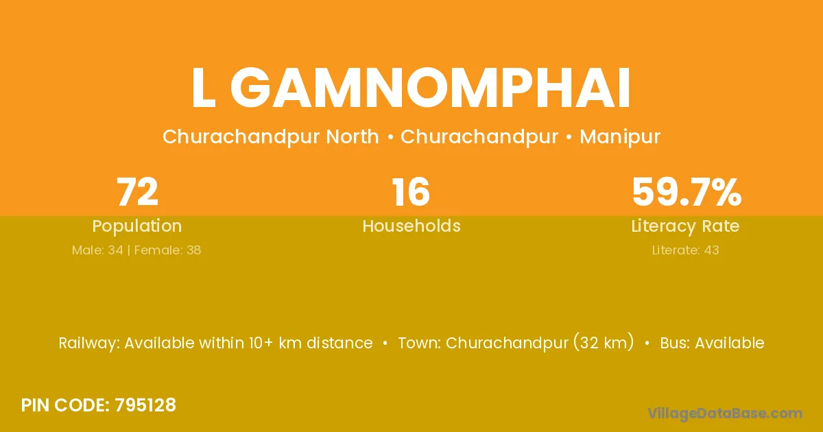 Churachandpur (32 km) is the nearest town to L Gamnomphai village for major economic activities and is located approximately 32 km away.