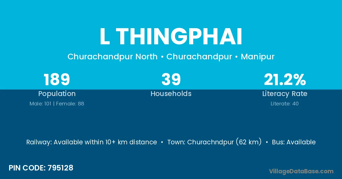 Churachndpur (62 km) is the nearest town to L Thingphai village for major economic activities and is located approximately 62 km away.
