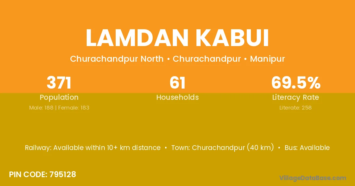 Churachandpur (40 km) is the nearest town to Lamdan Kabui village for major economic activities and is located approximately 40 km away.