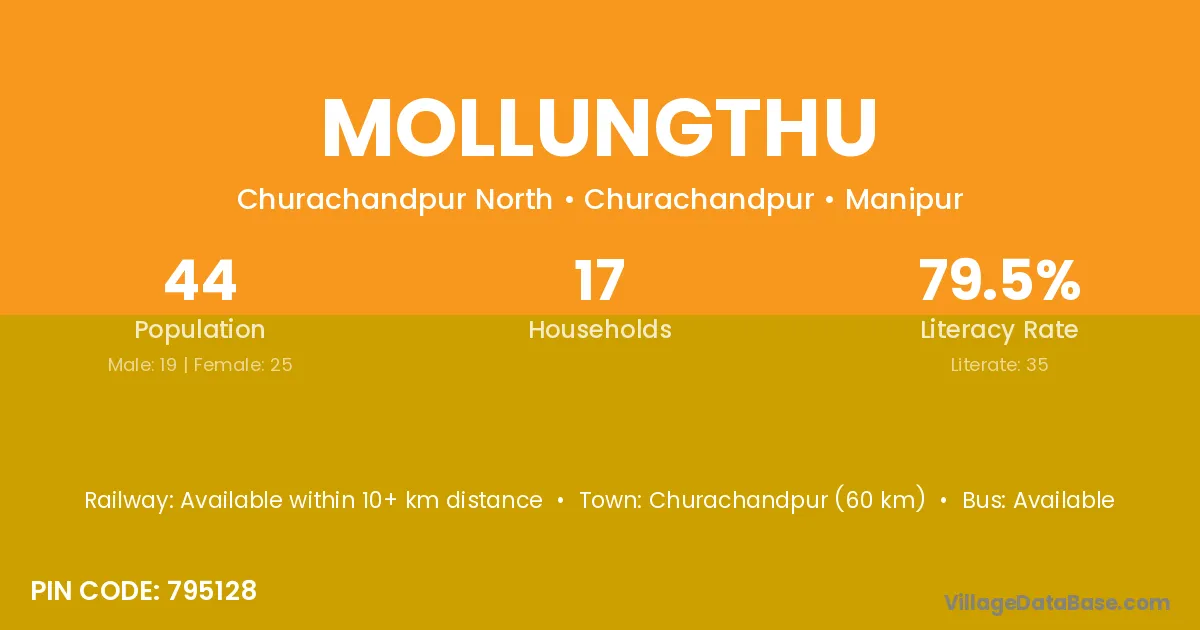 Churachandpur (60 km) is the nearest town to Mollungthu village for major economic activities and is located approximately 60 km away.