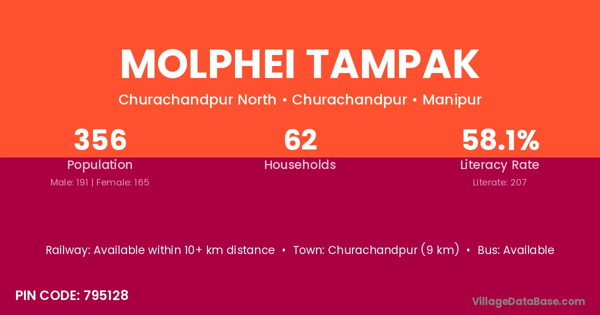Churachandpur (9 km) is the nearest town to Molphei Tampak village for major economic activities and is located approximately 9 km away.