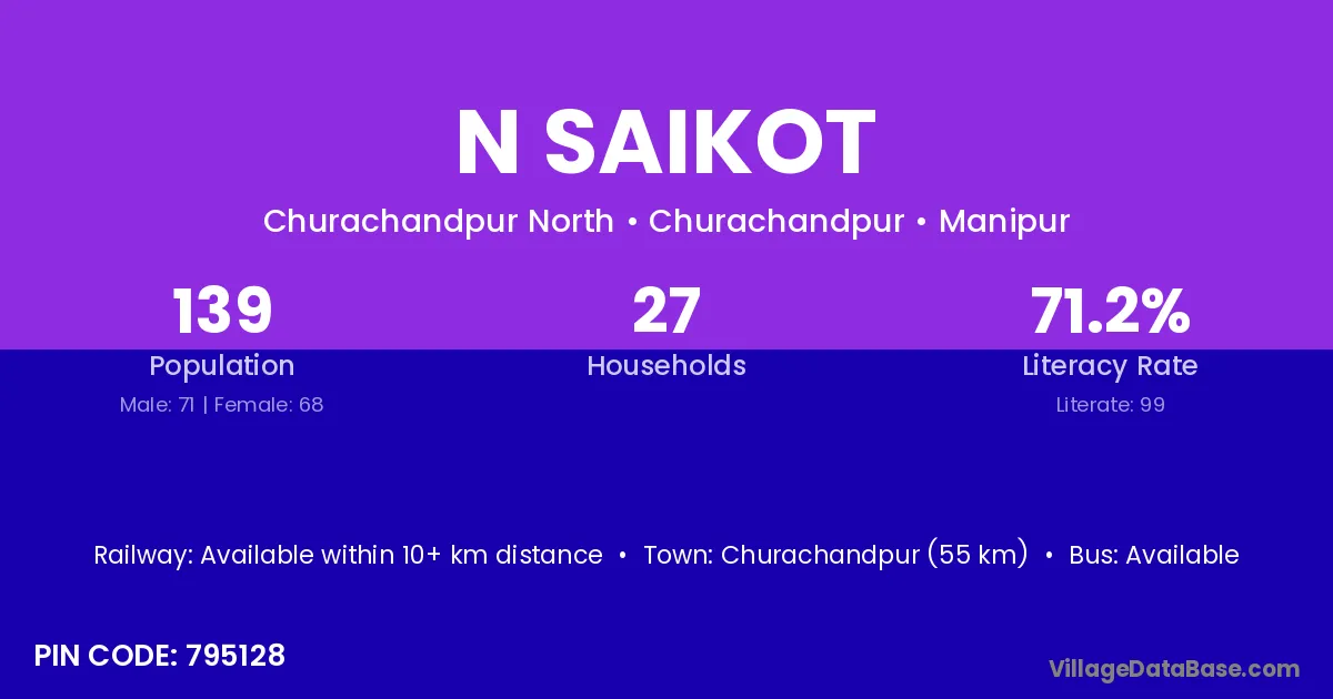 Churachandpur (55 km) is the nearest town to N Saikot village for major economic activities and is located approximately 55 km away.