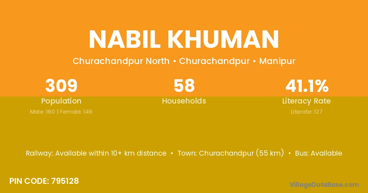 Churachandpur (55 km) is the nearest town to Nabil Khuman village for major economic activities and is located approximately 55 km away.