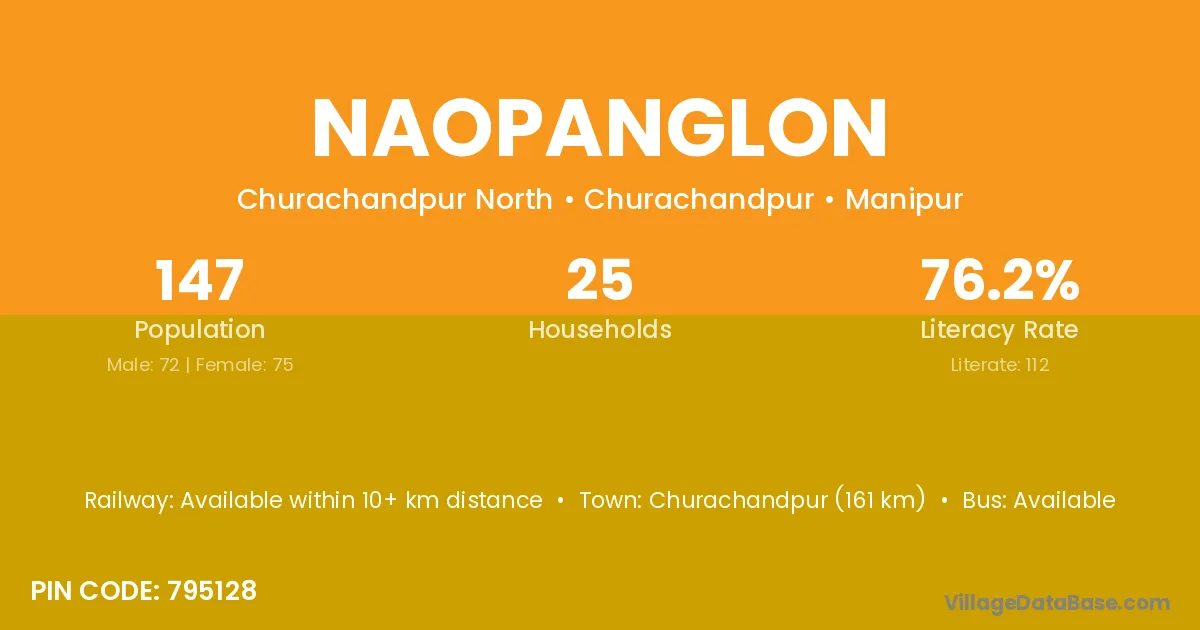Churachandpur (161 km) is the nearest town to Naopanglon village for major economic activities and is located approximately 161 km away.