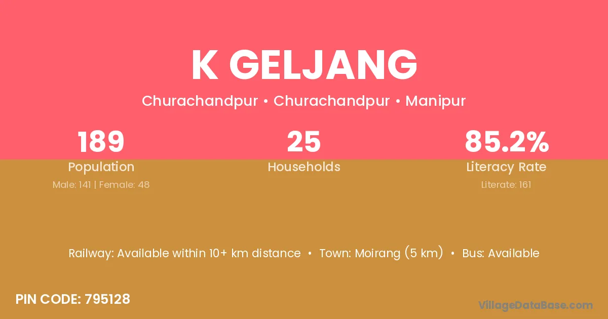 Moirang (5 km) is the nearest town to K Geljang village for major economic activities and is located approximately 5 km away.