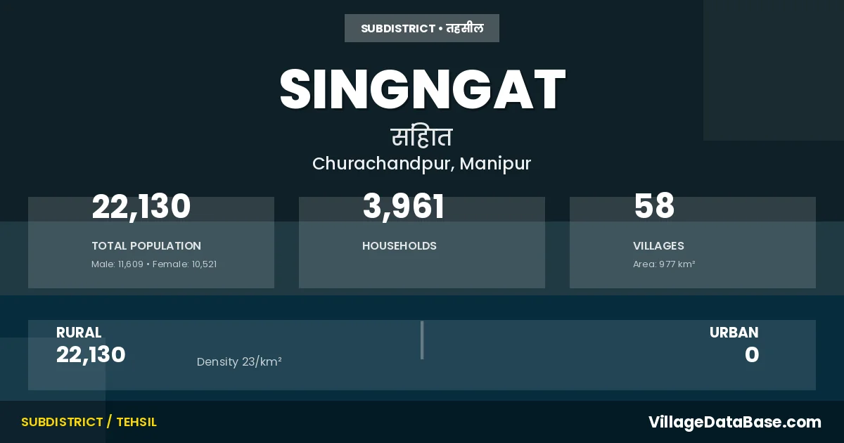Singngat is a town and Subdivision in the Churachandpur district of the Manipur. In India, a Subdivision is a subdivision of a district responsible for the administration and revenue collection of a specific area within the district. Subdivisions play a crucial role in the local governance structure, contributing significantly to the development and administration of their communities.