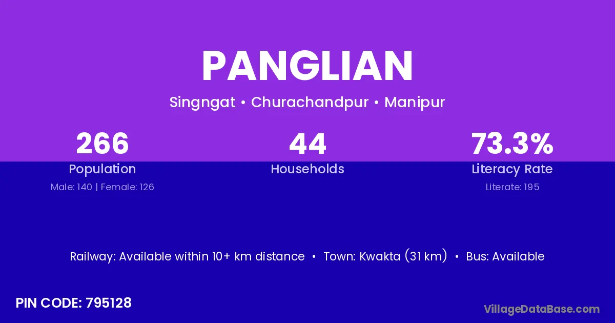 Kwakta (31 km) is the nearest town to Panglian village for major economic activities and is located approximately 31 km away.