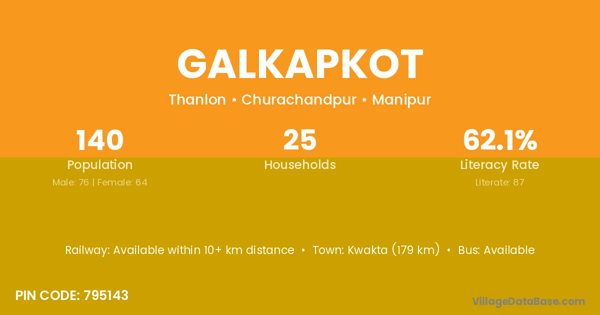 Kwakta (179 km) is the nearest town to Galkapkot village for major economic activities and is located approximately 179 km away.