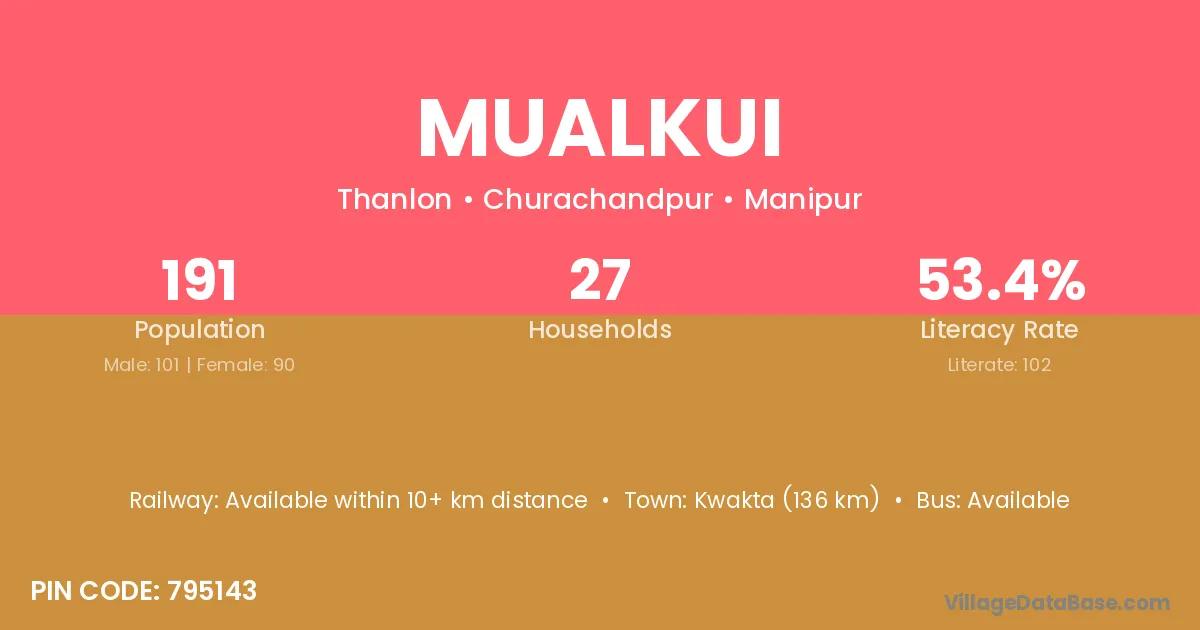 Kwakta (136 km) is the nearest town to Mualkui village for major economic activities and is located approximately 136 km away.