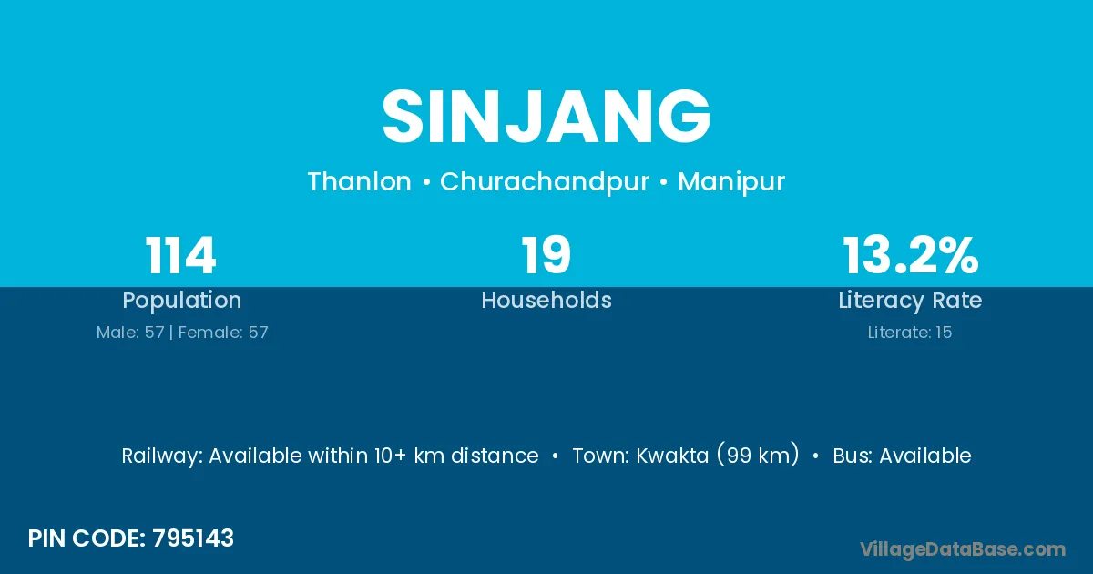 Sinjang village has a total population of 114 people, of which 57 are males and 57 are females.