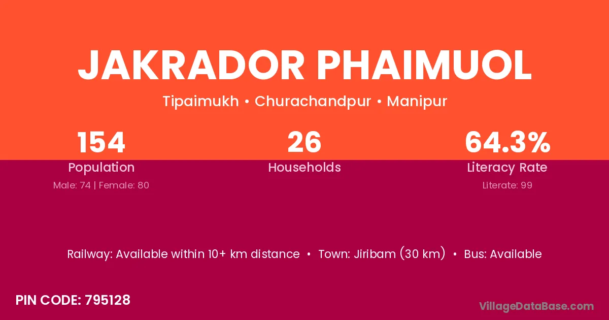 Jiribam (30 km) is the nearest town to Jakrador Phaimuol village for major economic activities and is located approximately 30 km away.