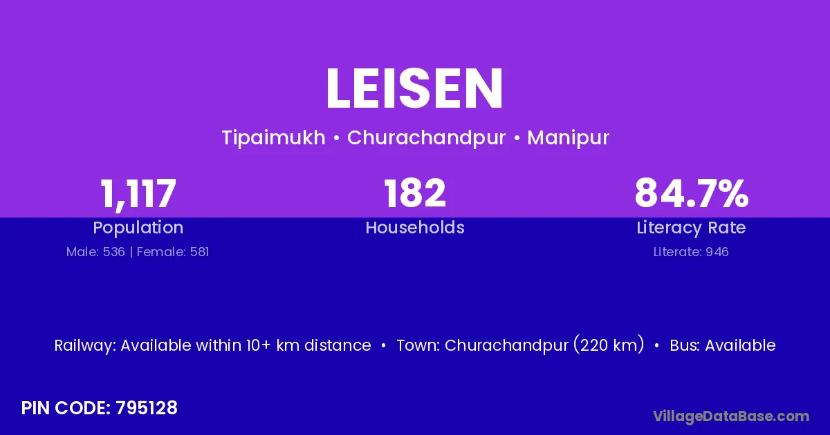 Churachandpur (220 km) is the nearest town to Leisen village for major economic activities and is located approximately 220 km away.