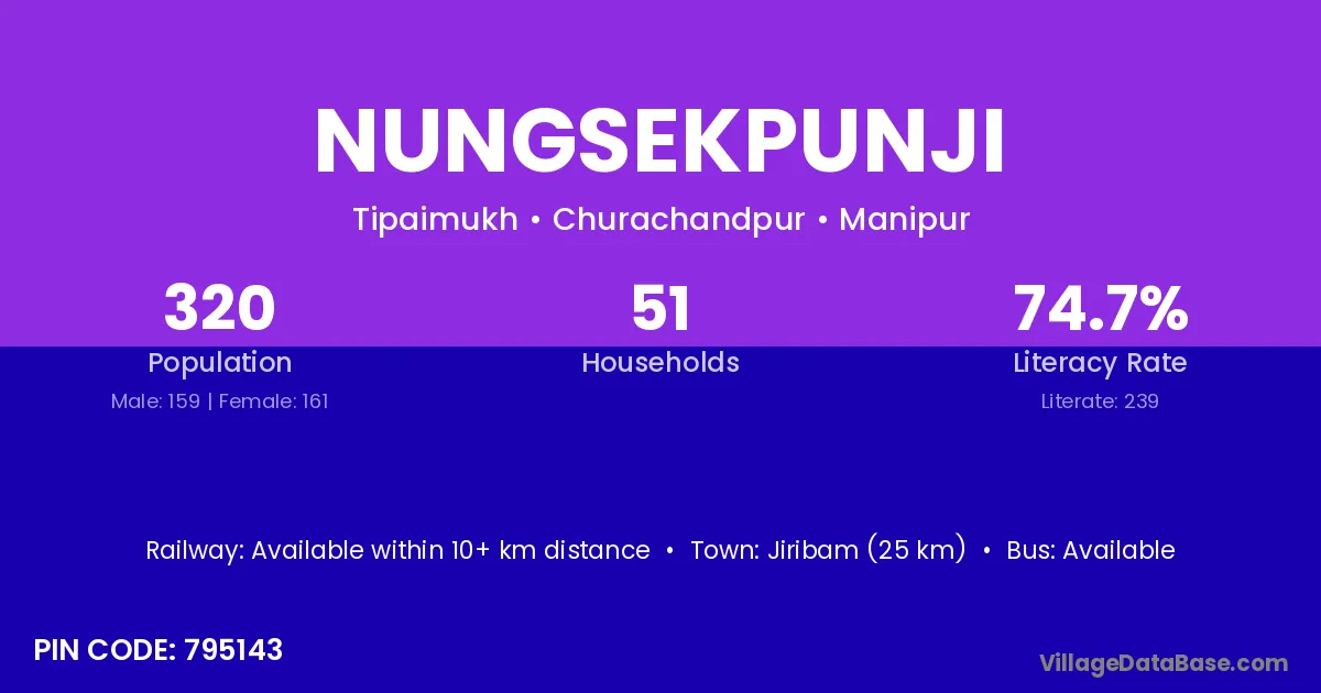 Jiribam (25 km) is the nearest town to Nungsekpunji village for major economic activities and is located approximately 25 km away.