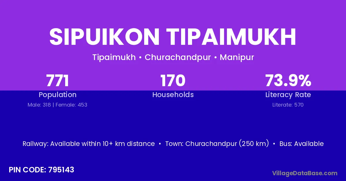 Churachandpur (250 km) is the nearest town to Sipuikon Tipaimukh village for major economic activities and is located approximately 250 km away.