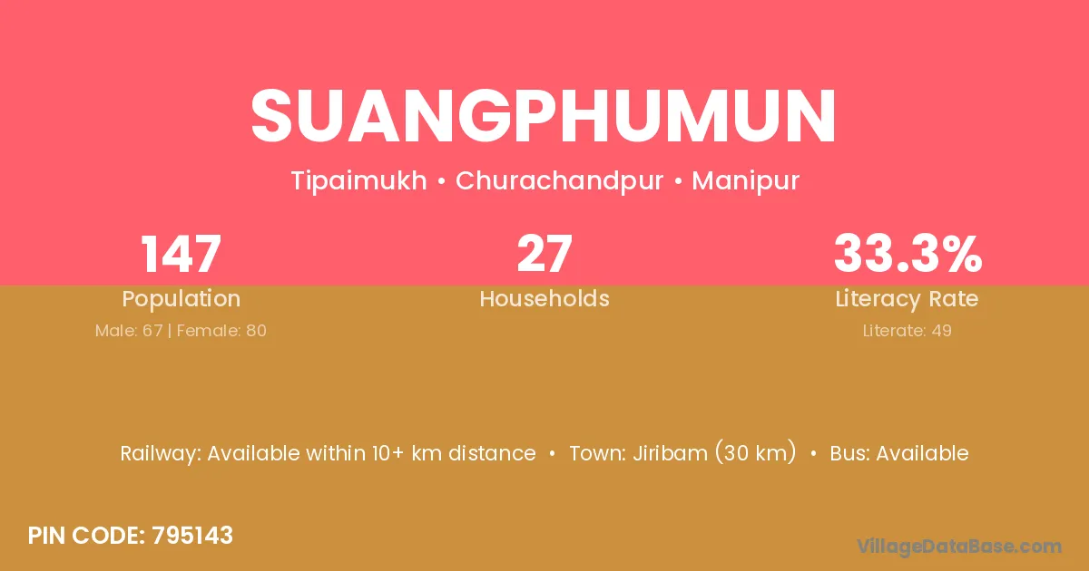 Jiribam (30 km) is the nearest town to Suangphumun village for major economic activities and is located approximately 30 km away.