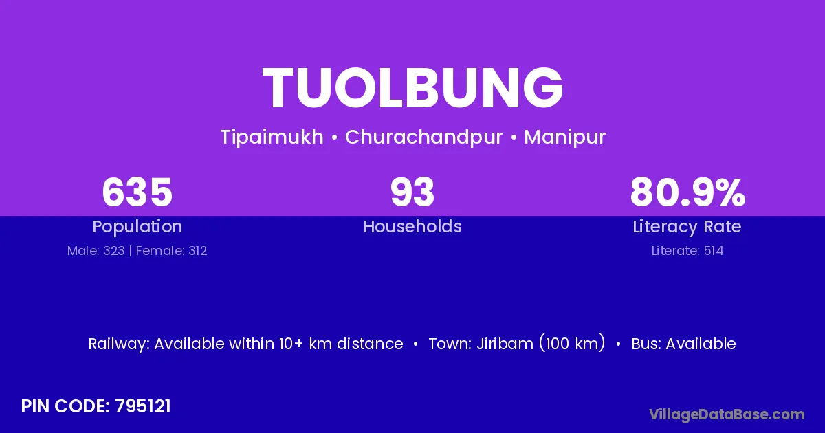 Jiribam (100 km) is the nearest town to Tuolbung village for major economic activities and is located approximately 100 km away.
