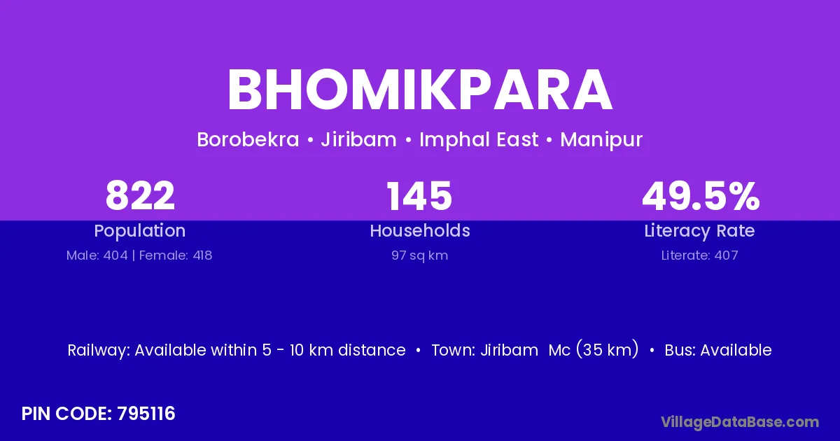 Jiribam Mc (35 km) is the nearest town to Bhomikpara village for major economic activities and is located approximately 35 km away.