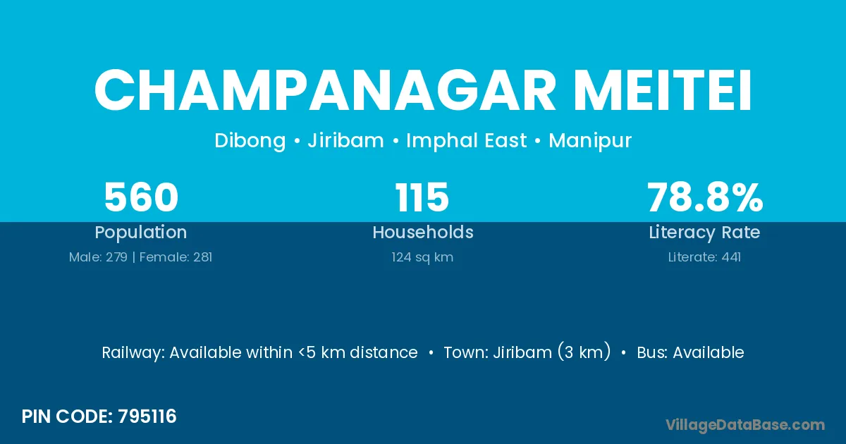 Jiribam (3 km) is the nearest town to Champanagar Meitei village for major economic activities and is located approximately 3 km away.