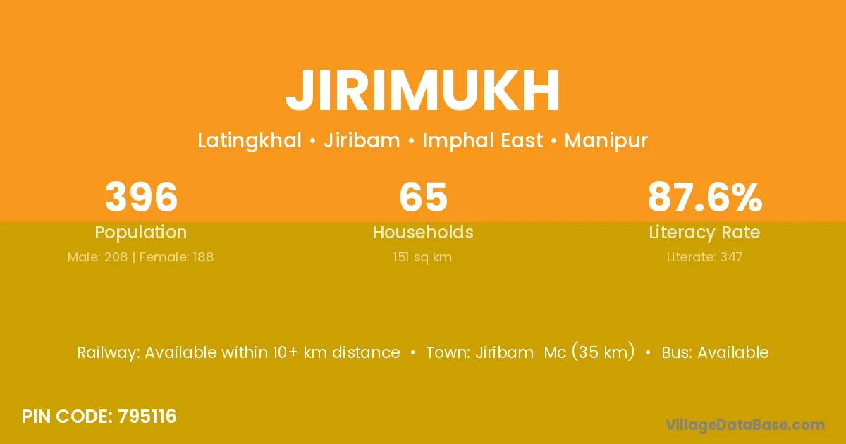 Jiribam Mc (35 km) is the nearest town to Jirimukh village for major economic activities and is located approximately 35 km away.