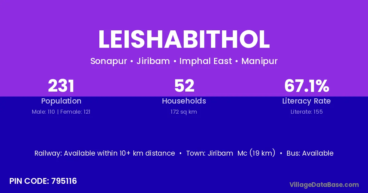 Jiribam Mc (19 km) is the nearest town to Leishabithol village for major economic activities and is located approximately 19 km away.