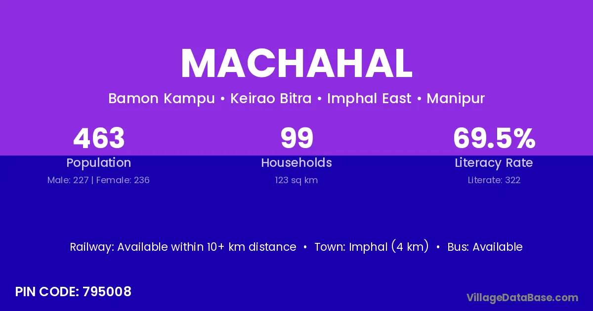 Imphal (4 km) is the nearest town to Machahal village for major economic activities and is located approximately 4 km away.