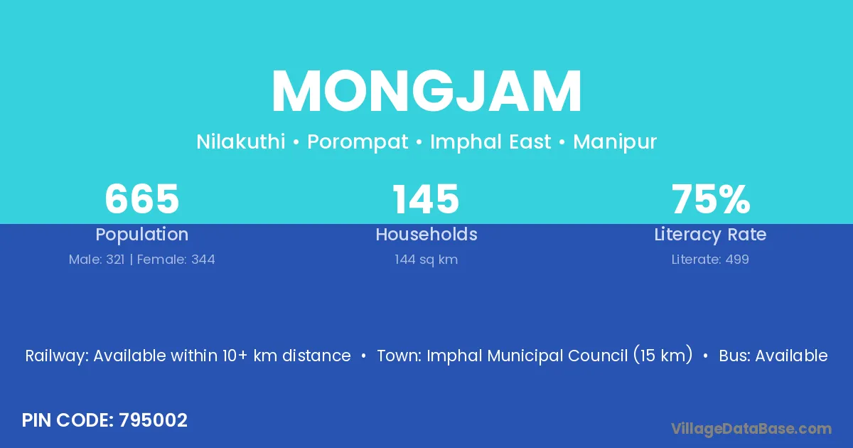 Imphal Municipal Council (15 km) is the nearest town to Mongjam village for major economic activities and is located approximately 15 km away.
