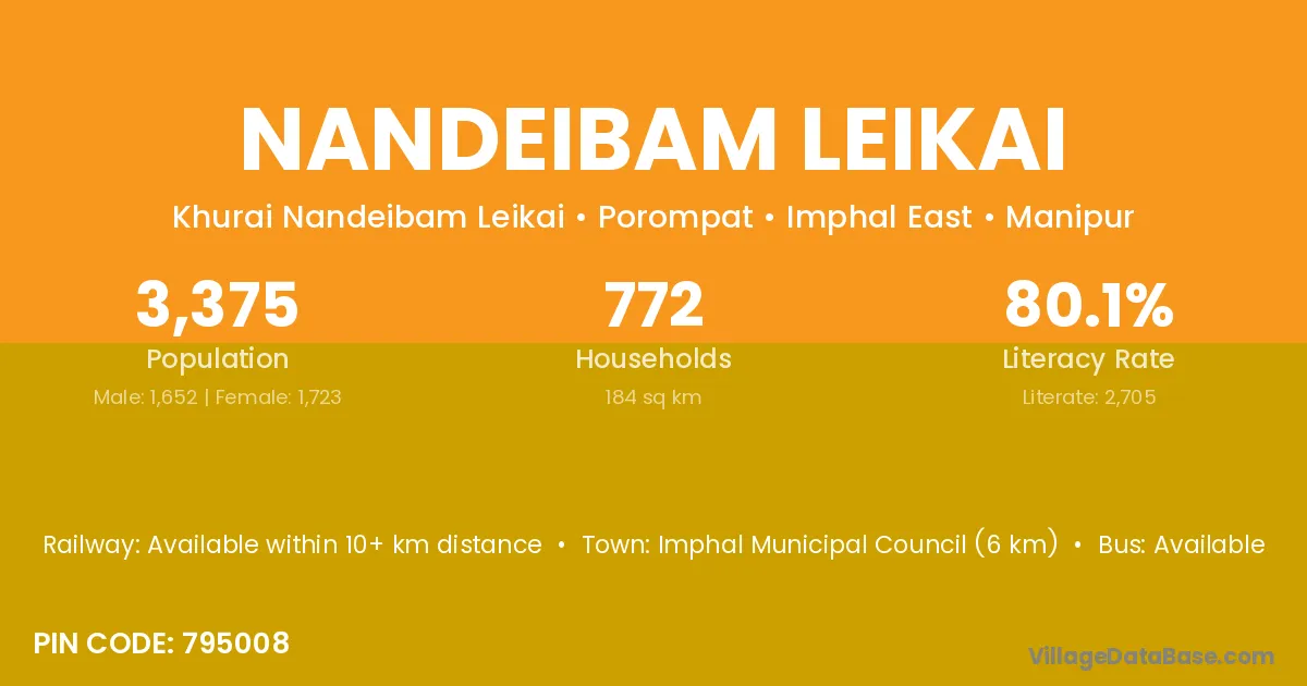 Imphal Municipal Council (6 km) is the nearest town to Nandeibam Leikai village for major economic activities and is located approximately 6 km away.